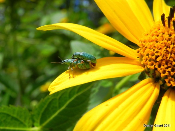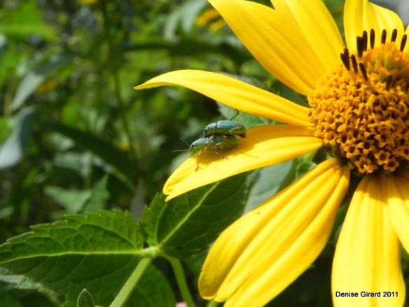 Un peu de bleu…à y regarder de plus près je dirai plutôt vert métallisé sur une belle fleur jaune… Le nom de l’insecte si vous voulez faire connaissance est ici prenant la pose sur une fleur violette…