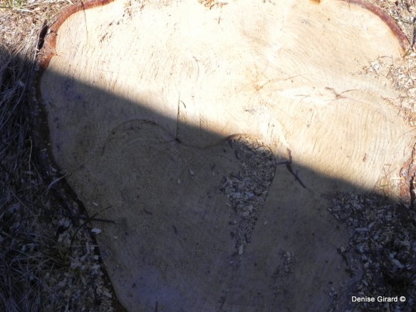 Dans l’ombre se cache un coeur, vous le voyez ?…arbre abattu avec tristesse il était bouffé de l’intérieur par des fourmis charpentières…(On l’a caché à Idéfix)