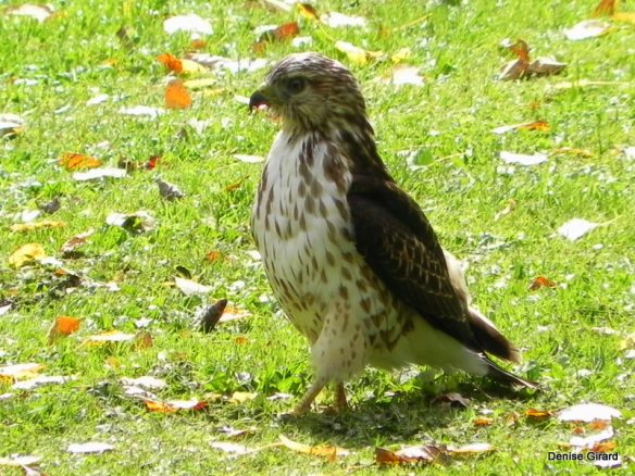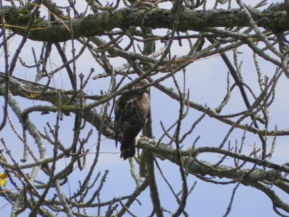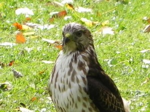 Est-ce une buse pattue ? Je ne suis pas certaine. Si vous reconnaissez la bestiole, prière de me le dire. Aperçu dans la région de Mont-Laurier, Québec la fin de semaine du 5 octobre. Le geai bleu se perchait au dessus de lui et l’attaquait d’un coup de bec sur sa tête…il n’a pas apprécié… 🙂