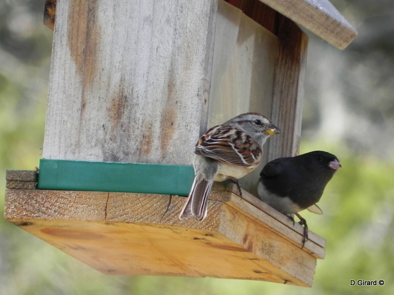 DSCN4906 DSCN4910 DSCN4918 Junco ardoisé et moineau s’en donnent à coeur joie dans la mangeoire.DSCN4950