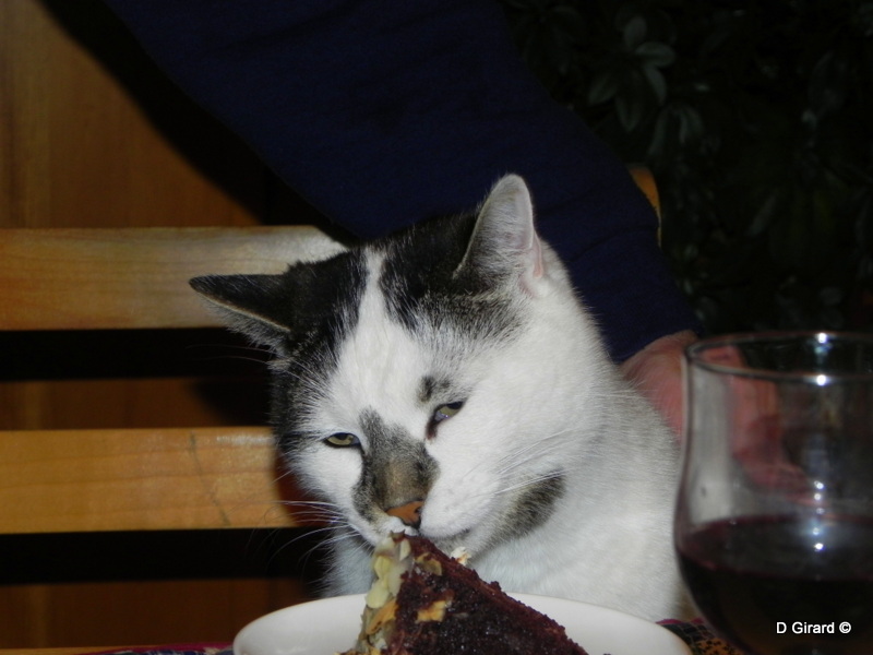 Finalement l’gros matou aurait dû manger du gâteau & ne pas trop boire de vino ! Et puis devinez les amis !!! Aujourd’hui il pleut…………..fait froid et il vente….JE DÉMÉNAGE DANS MA MAISON !