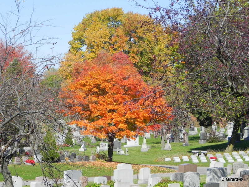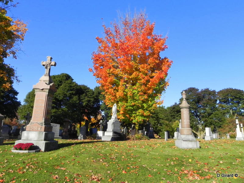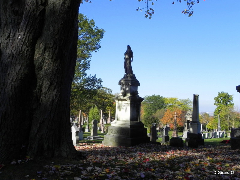 L’automne est ma saison favorite pour une balade au cimetière. Habituellement je choisis toujours le cimetière Notre-Dame-Des-Neiges. Mais pour cette fois-ci je suis de l’autre côté de la clôture sur le flanc nord de la montagne au cimetière Mont-Royal.