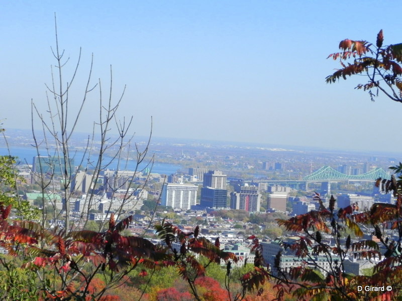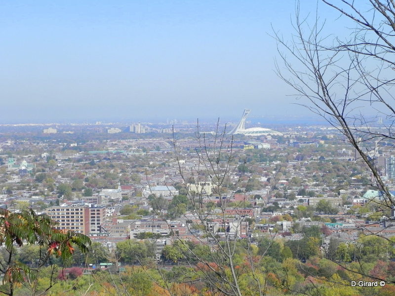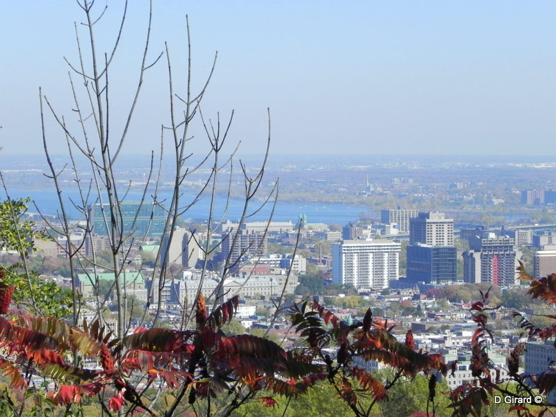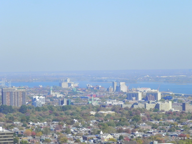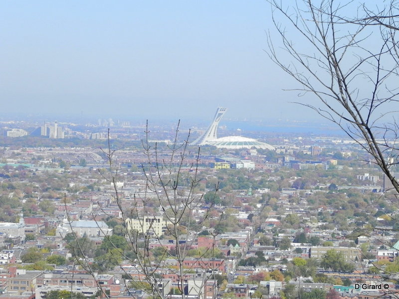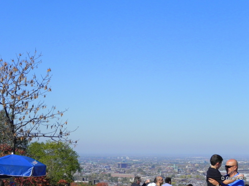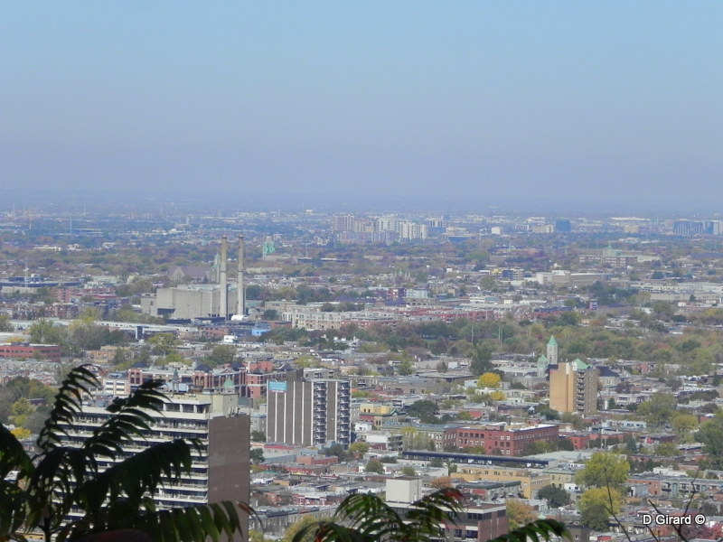 Un petit bout de Montréal sur le Mont-Royal. Là où ma pile de caméra m’a fait faux bond…snif… C’était légèrement brumeux…ou alors c’était le smog…M’enfin ce n’était pas ma lentille de caméra qui était sale, voilà !