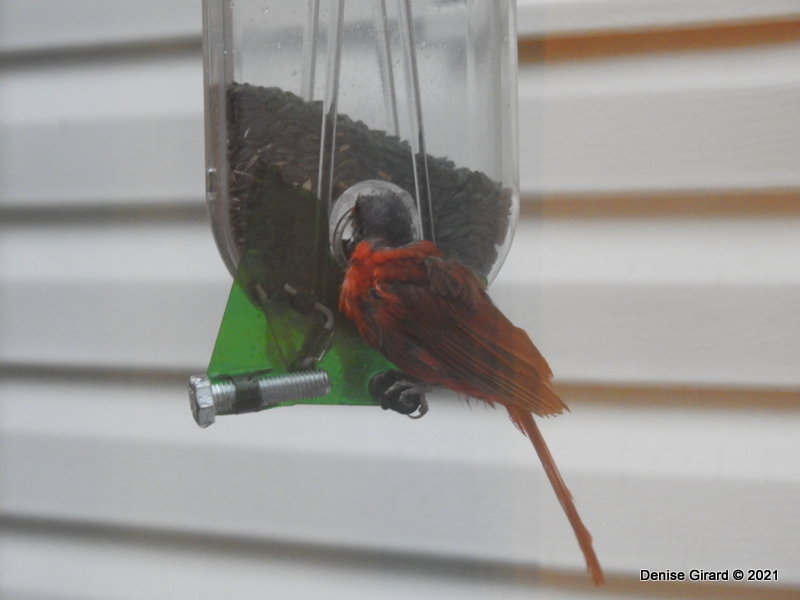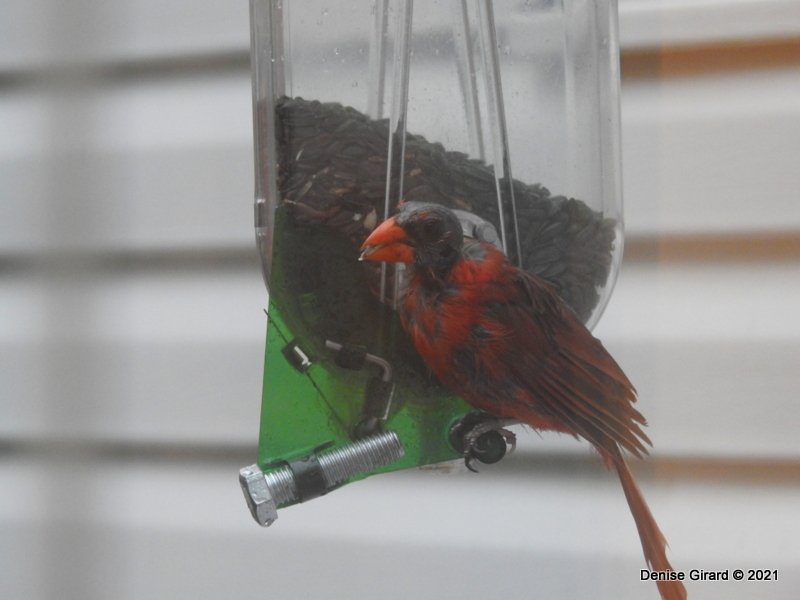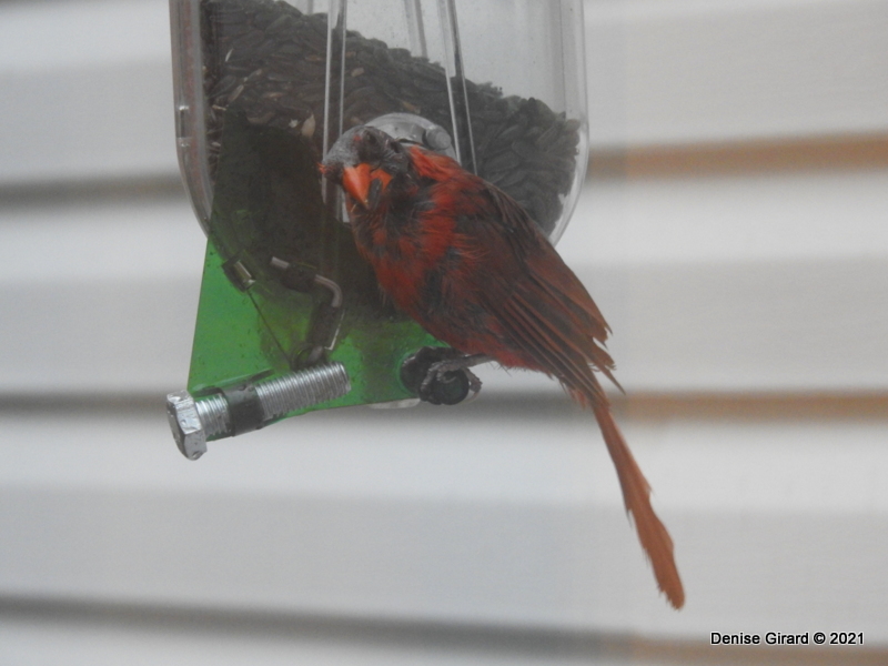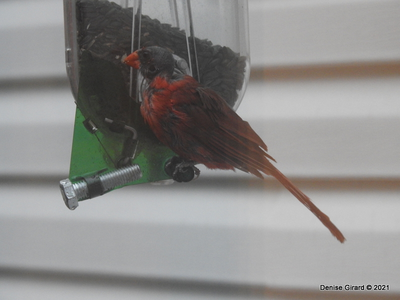 Un immense merci à Caroline D, ici bas dans les commentaires. Elle m’a apporté la réponse. Cet oiseau est bien un cardinal…mais en mue. Avec cette tête d’urubu, il a d’affaire à muer vite.